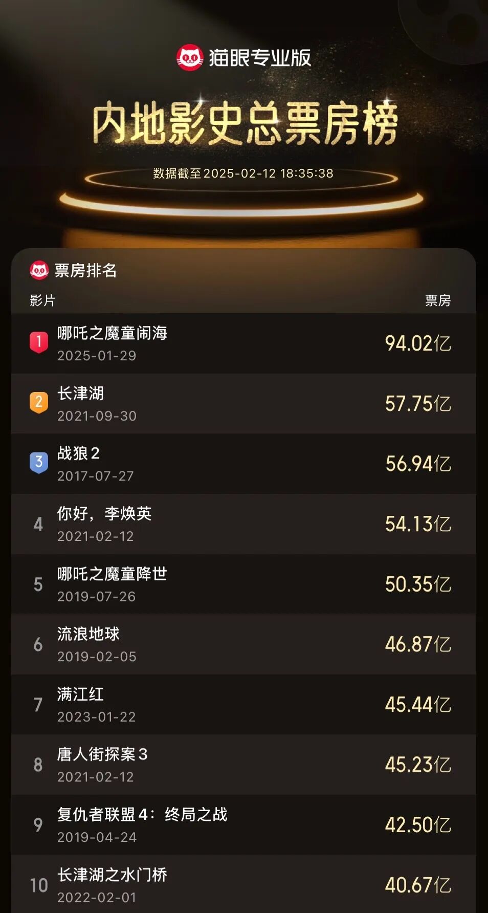 另一边最近《哪吒之魔童闹海》热映(简称《哪吒2》),现据猫眼专业版数据显示,截至2月12日18:35左右,《哪吒之魔童闹海》 上映15天,总票房(含预售)已超过94亿元,不仅登顶中国影史票房榜首,同时也已进入全球影史票房榜前25名。大家都去看了吗?