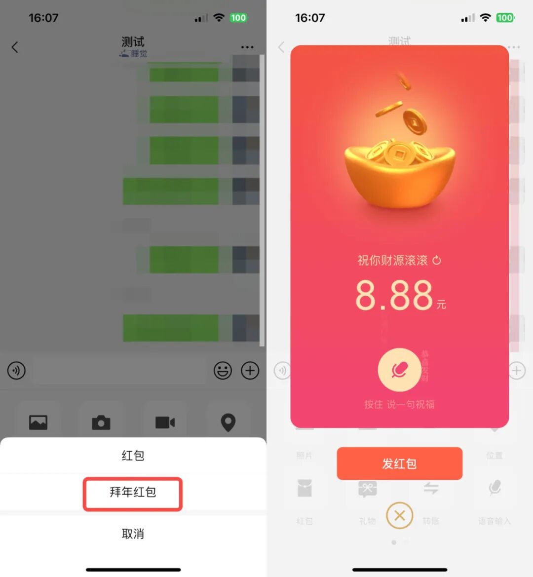 如上图所见,像现在发放拜年红包时,可以按住录制语音祝福。