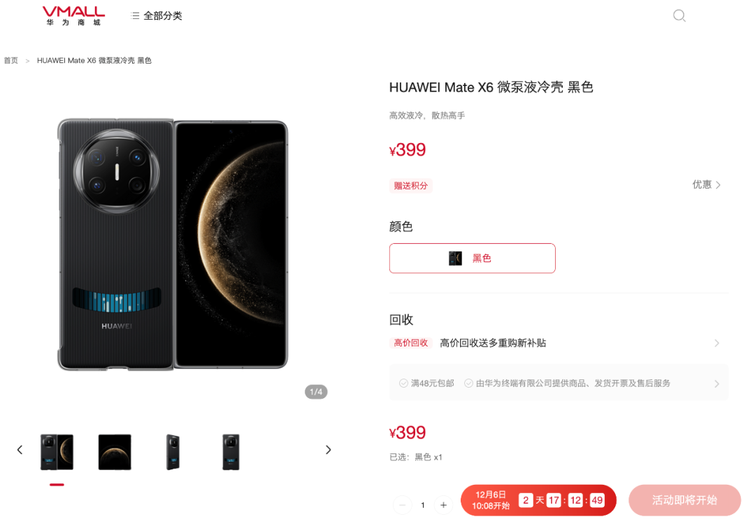 华为Mate X6微泵液冷壳则售价399元,将于12月6日10:08正式开售。