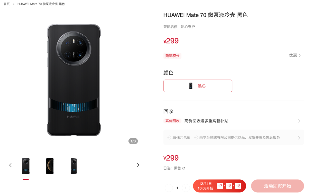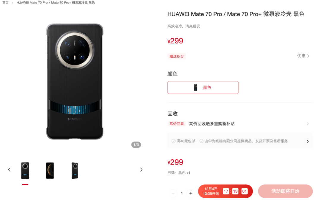 华为Mate 70 Pro和Pro+的微泵液冷壳同样售价299元,将于12月4日10:08正式开售。