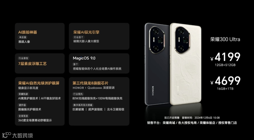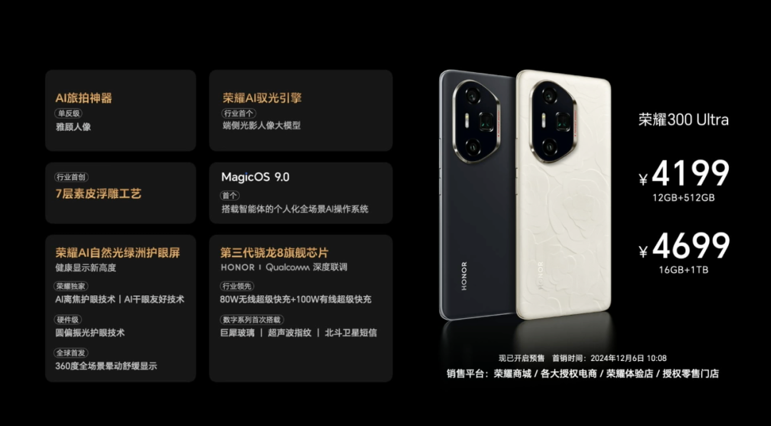 价格上,荣耀300 Ultra:12+512GB版售价4199元,16GB+1TB版售价4699元,目前已开启预售,将于12月6日正式开售。大家觉得这次的Ultra怎么样?
