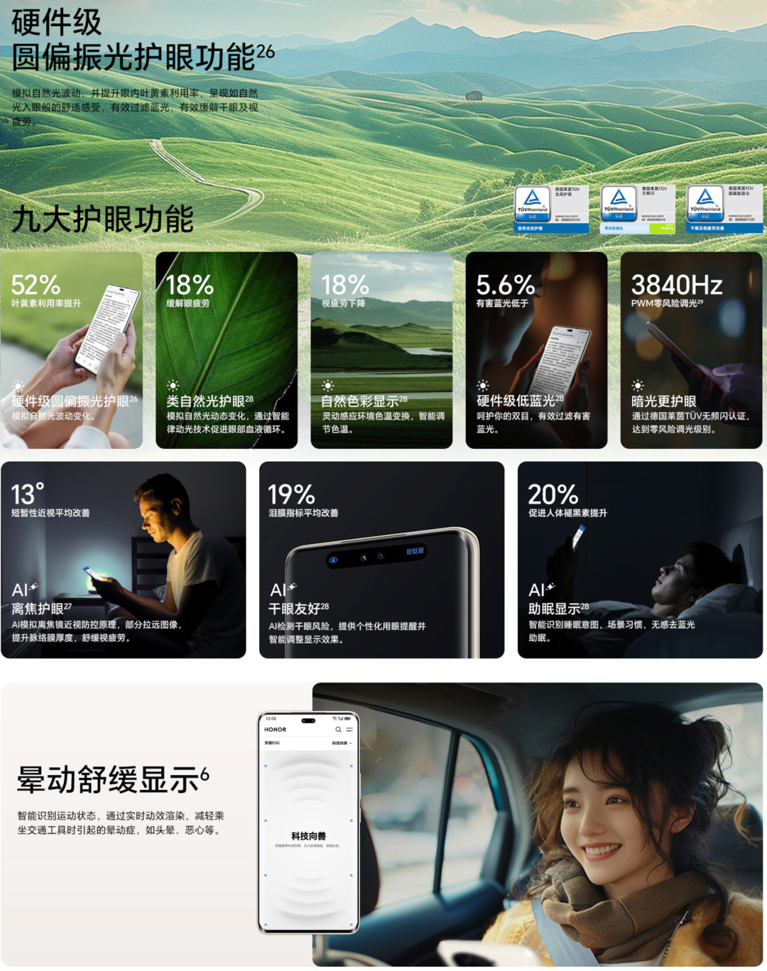 屏幕部分,荣耀300系列主打AI自然光绿洲护眼屏,荣耀300 Ultra采用6.78英寸2700*1224分辨率的1.5K居中双挖孔AMOLED四曲屏,120Hz刷新率,3840Hz PWM高频调光,支持全场景湿手触控和AI防误触,3D超声波屏下指纹,荣耀巨犀玻璃盖板,塑料弧度中框。