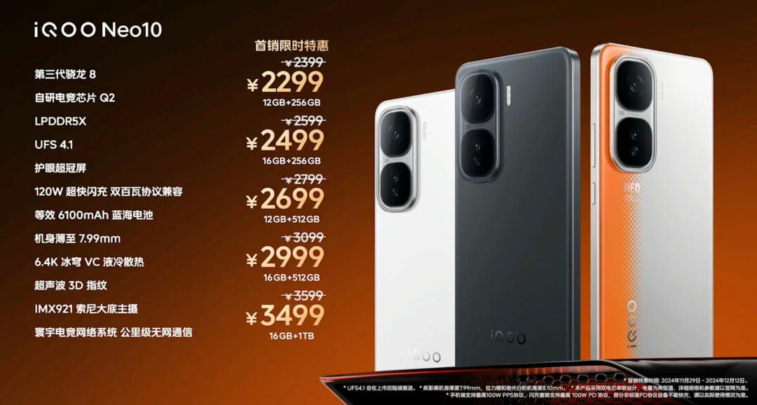 价格上,iQOO Neo10:12+256GB版首销价2299元,16+256GB版首销价2499元,12+512GB版首销价2699元,16+512GB版首销价2999元,16GB+1TB版首销价3499元,现已开售。