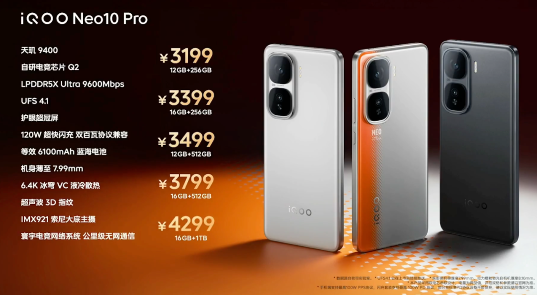 价格上,iQOO Neo10 Pro:12+256GB版售价3199元,16+256GB版3399元,12+512GB版3499元,16+512GB版3799元,16GB+1TB版4299元,目前已经现货开售。这波大家觉得如何?