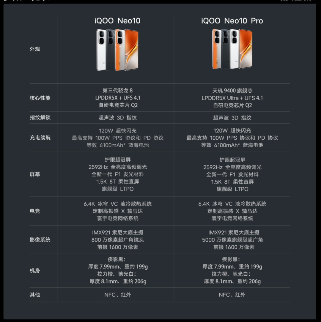 核心配置上,iQOO Neo10前置16MP,后置双摄①50MP主摄有OIS IMX921 ②8MP超广角,支持4大蓝厂旗舰影像算法、5大趣味功能;搭载骁龙8 Gen3处理器,自研电竞芯片Q2,LPDDR5X、UFS4.1,6.4K 冰穹VC液冷散热系统,6100mAh蓝海电池、120W有线快充(支持100W PPS),支持NFC、红外遥控、封闭式立体双扬、大体积X轴马达、双频GPS等,运行基于Android 15开发的OriginOS 5等。