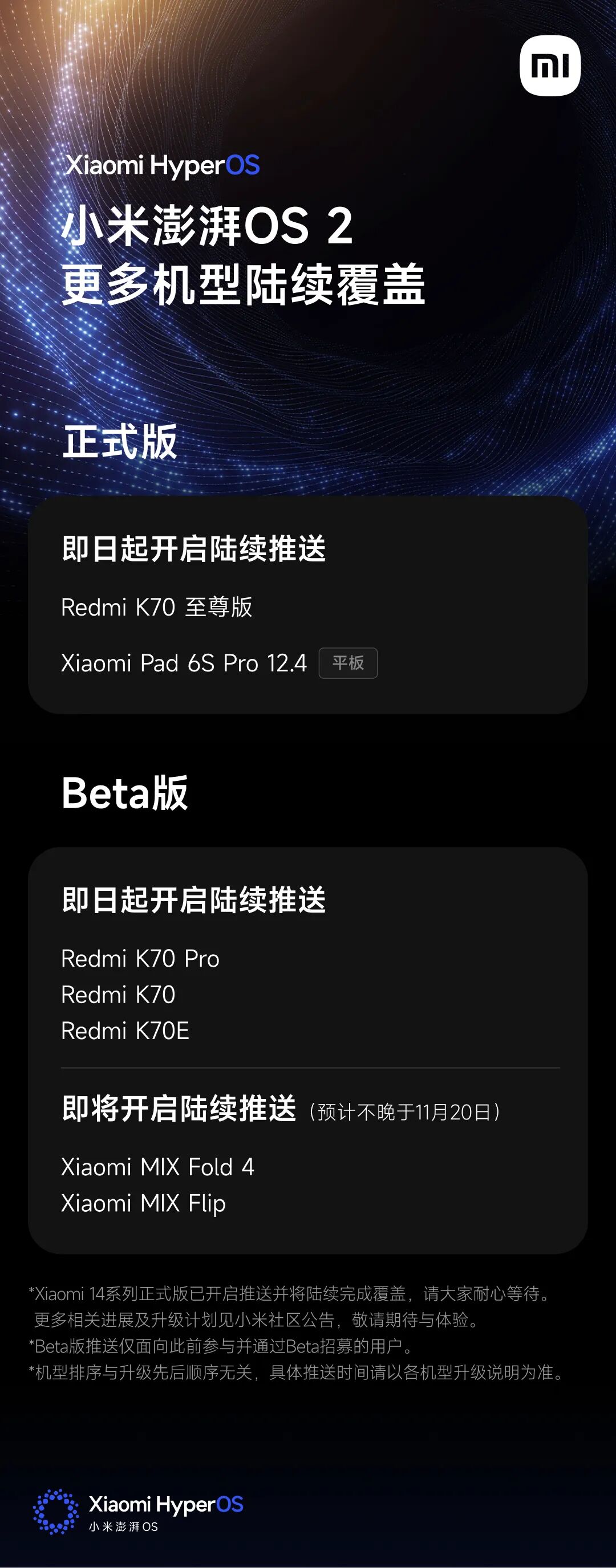 如上图所见,昨晚澎湃OS2宣布面向Redmi K70至尊版和小米Pad6S Pro 12.4开启正式版的陆续推送(预计先是正式版内测用户收到),而Redmi K70、K70E、K70 Pro开启Beta版的陆续推送,小米MIX Fold4和MIX Flip则预计不晚于11月20日陆续推送Beta版。