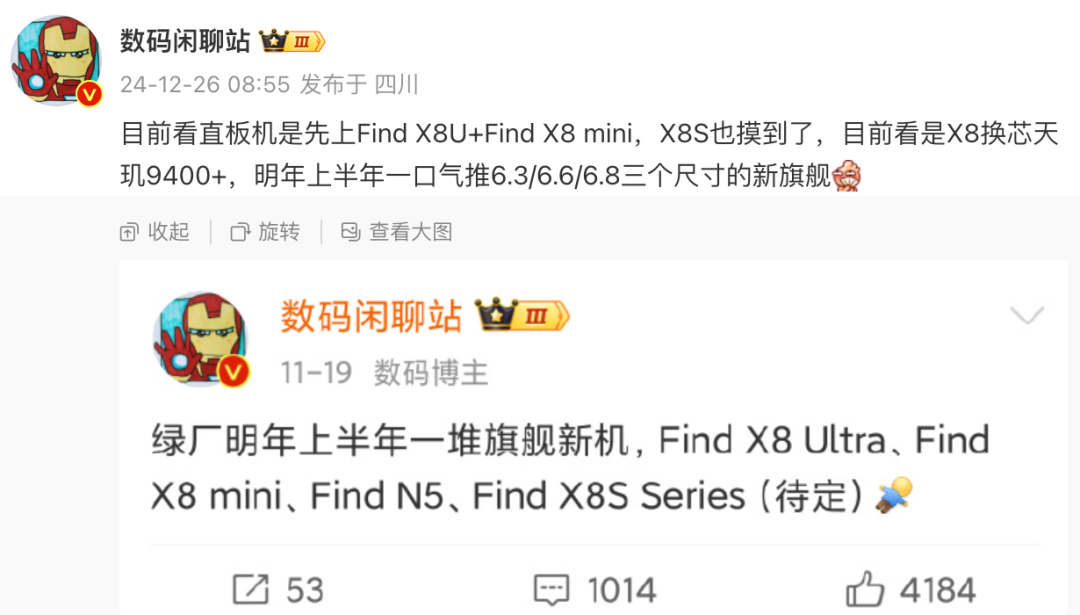 10月下旬OPPO发布了Find X8系列,带来了Find X8和Find X8 Pro两款新旗舰,分别采用6.59英寸和6.78英寸显示屏,当时有传闻称Find X8后续或带来一款屏幕更小的mini版本,现在关于OPPO新机有更多消息。