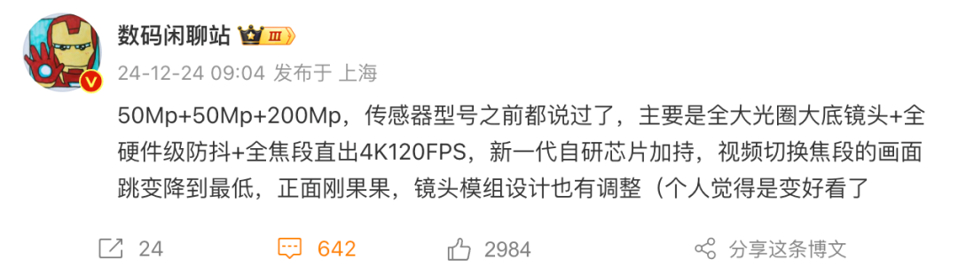 如上图所见,爆料达人数码闲聊站暗示,vivo X200 Ultra后置三摄①50MP主摄 ②50MP超广角 ③200MP潜望长焦,影像卖点主要是全大光圈大底镜头+全硬件级防抖+全焦段直出4K120FPS,还会配备新一代自研芯片,视频切换焦段的画面跳变降到最低,将正面刚苹果,他还表示镜头模组设计也有调整、个人觉得是变好看了。可以关注下后续消息~