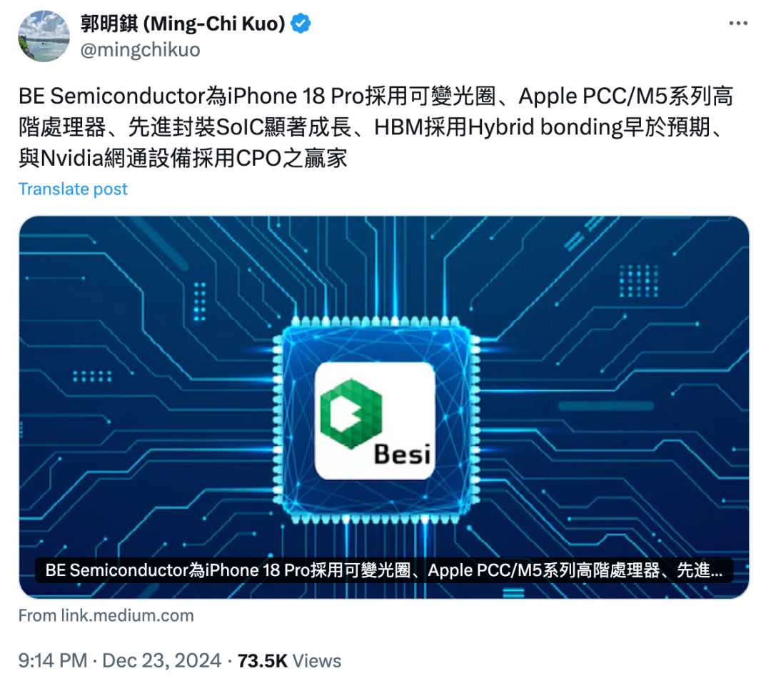 如上图所见,近日天风国际分析师郭明錤在分析报告中称苹果2026年发布的iPhone 18 Pro预计升级配备可变光圈,关键组件光圈叶片之组装设备由BESI供应。如果消息属实的话,这应该也是苹果首次给手机配备可变光圈🤔。