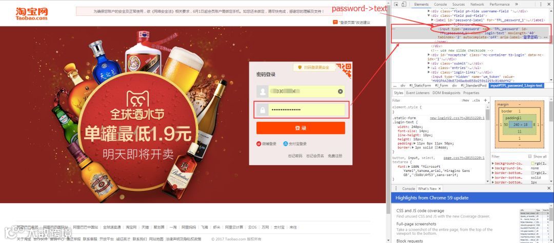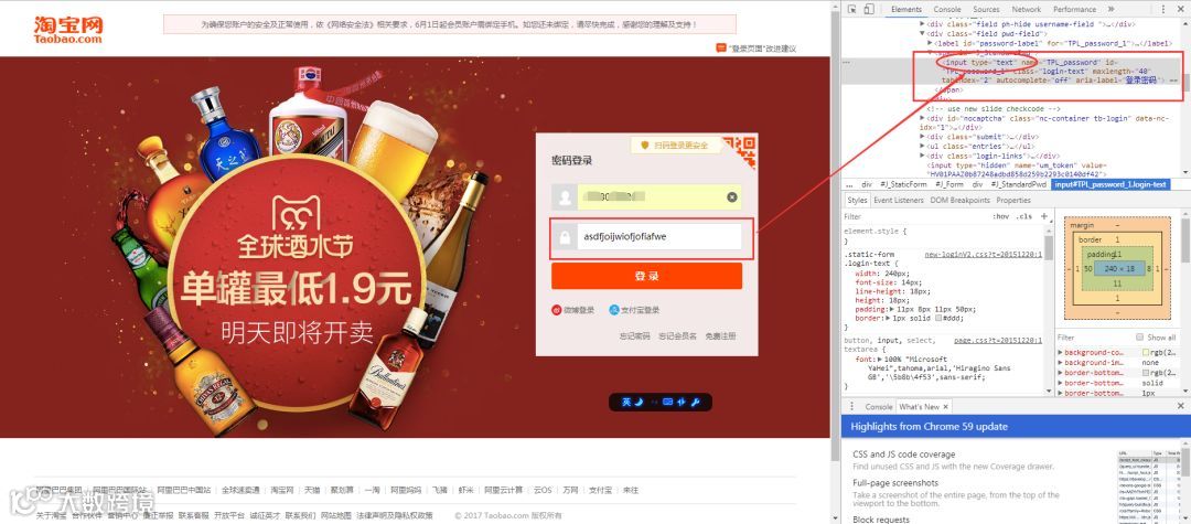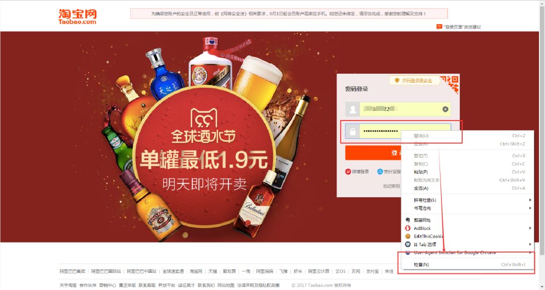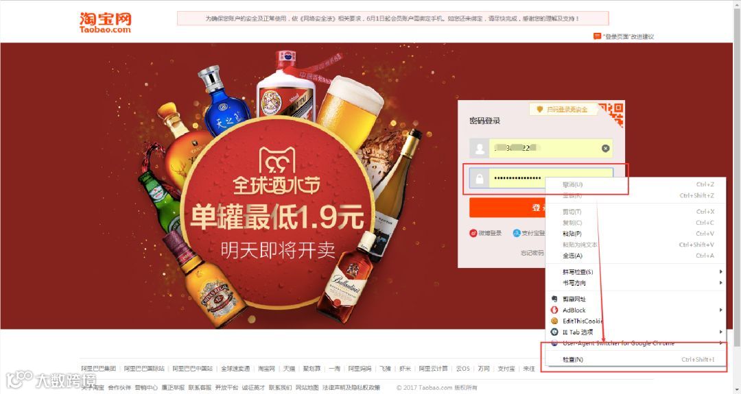 再举个小例子:我们都知道,使用浏览器"记住密码"的功能,密码会变成一堆小黑点,是不可见的。可以让密码显示出来吗?可以,只需给页面"动个小手术"!以淘宝为例,在输入密码框处右键,点击检查。