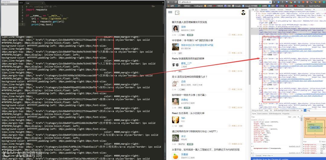 左侧是我们程序获得的结果,右侧是我们在www.gitbook.cn网站审查元素获得的信息。我们可以看到,我们已经顺利获得了该网页的HTML信息。这就是一个最简单的爬虫实例,可能你会问,我只是爬取了这个网页的HTML信息,有什么用呢?客官稍安勿躁,接下来会有网络小说下载(静态网站)和优美壁纸下载(动态网站)实战,敬请期待。