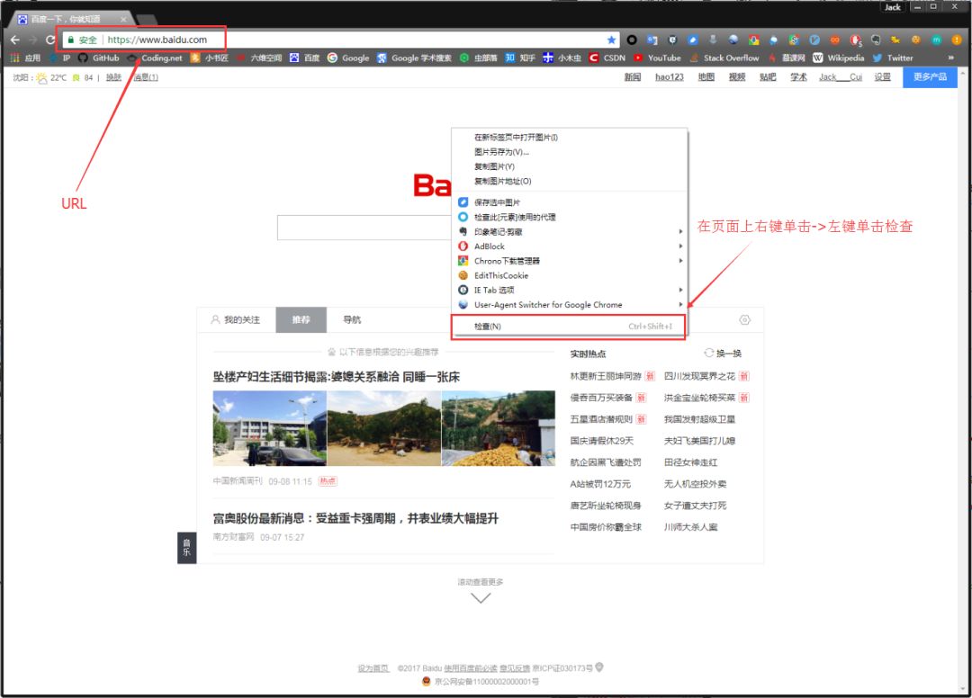 在浏览器的地址栏输入URL地址,在网页处右键单击,找到检查。(不同浏览器的叫法不同,Chrome浏览器叫做检查,Firefox浏览器叫做查看元素,但是功能都是相同的)