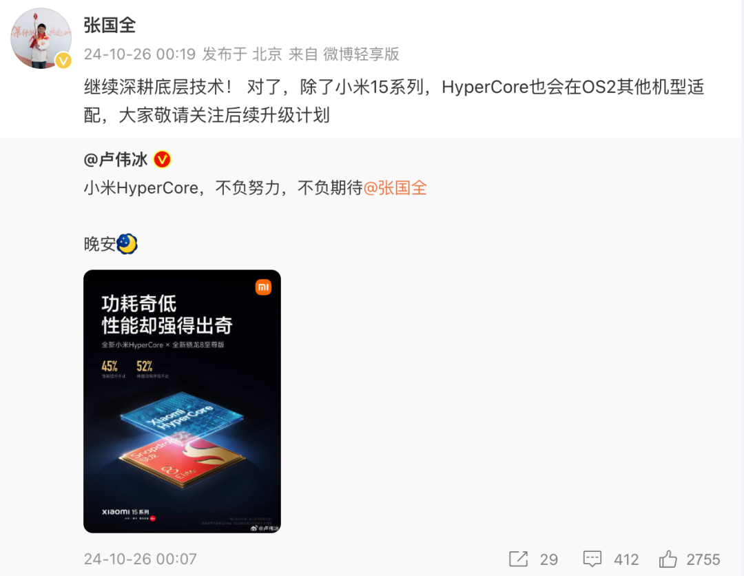 小米将于10月29日19点举行小米15系列暨小米澎湃OS 2新品发布会,据了解届时将发布小米15、小米15 Pro、小米澎湃OS 2、小米SU7 Ultra量产版、小米Watch S4、小米手环9 Pro等多款新品,其中澎湃OS2曾预热称系统内核HyperCore全面焕新,除了小米15系列外,其他机型也会适配,小米手机系统软件部总监张国全在微博互动时透露了相关情况。