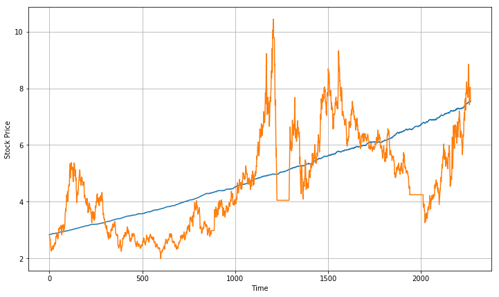 S_modelavg=list()for i in range(len(In_S_true)):S_modelavg.append(np.average(S_model[i,:]))plt.figure(figsize=(12,7))plt.grid(True)plt.xlabel('Time')plt.ylabel('Stock Price')plt.plot(S_modelavg)plt.plot(S_true.iloc[:,1])