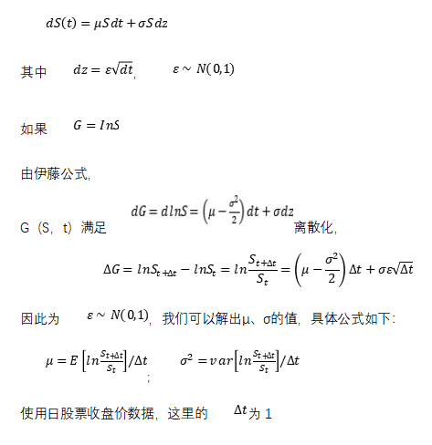 data=pd.read_csv(r'C:\Users\10547\Desktop\Midterm\data\002436.SZ.CSV',encoding='gbk')S_true=pd.DataFrame(data,columns=['日期','前收盘价(元)'])In_S_true=list()for i in range(len(S_true.iloc[:,1])-1):In_S_true.append(np.log(S_true.iloc[i+1,1]/S_true.iloc[i,1]))mu=np.mean(In_S_true)sigma=np.sqrt(np.var(In_S_true))