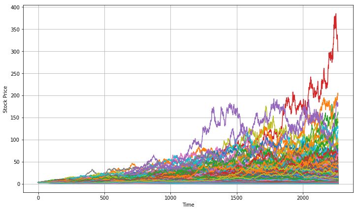 plt.figure(figsize=(12,7))plt.grid(True)plt.xlabel('Time')plt.ylabel('Stock Price')for i in range(I):plt.plot(S_model[:,i])