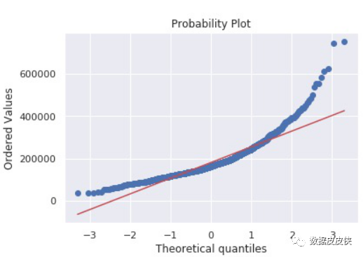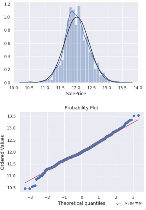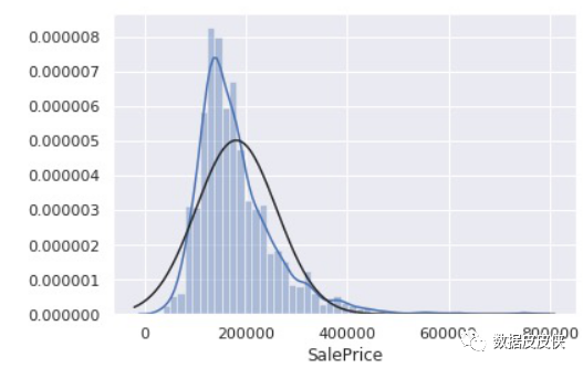 回到之前第一步中观察的因变量分布图,并将它与正态分布比对,我们需要做的,是使它通过某种转换,尽可能的贴合正态分布曲线。