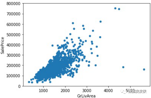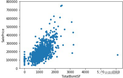 我们可以使用plot.scatter方法将数字类型变量与因变量房价的关系用散点图画出:(以下依次为房屋地下室总面积和小区总面积)