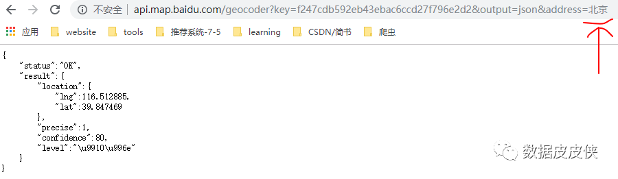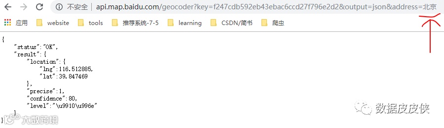 查询经纬度位置 (谷歌浏览器打开,在该地址后面,加上你要查询的地址,例如:北京):http://api.map.baidu.com/geocoder?key=f247cdb592eb43ebac6ccd27f796e2d2&output=json&address=