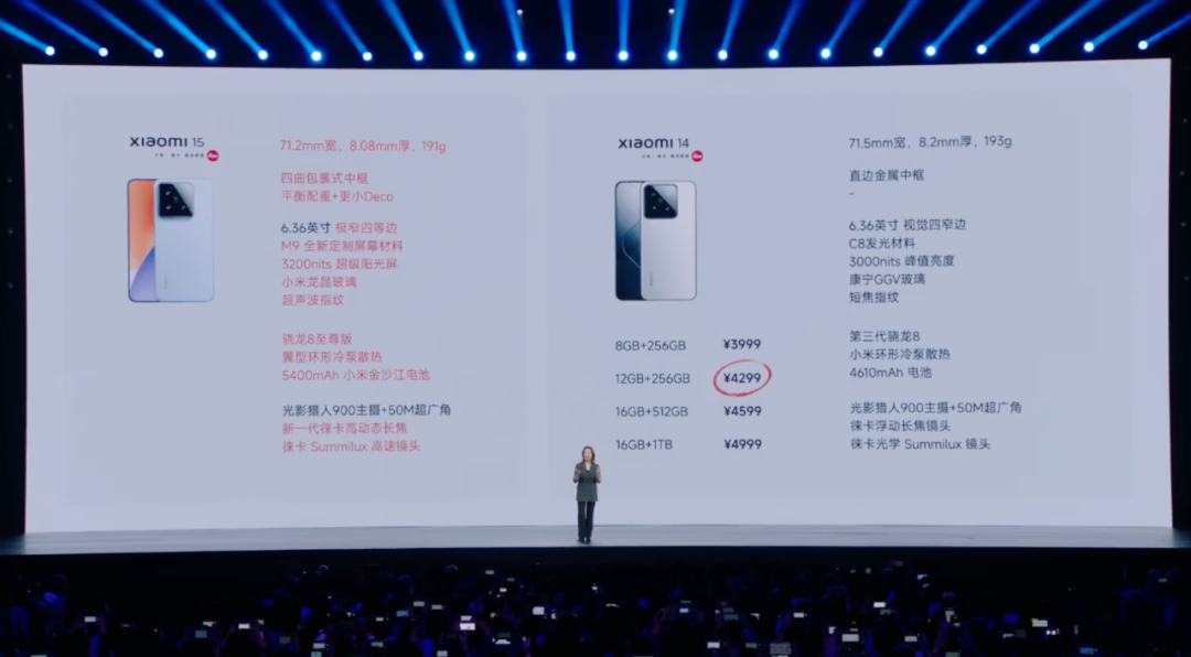 价格上,【小米15】12+256GB版本售价4499元,12+512GB版本售价4799元,16+512GB版本售价4999元,16GB+1TB版本5499元,目前已经开启预售,将于10月31日10点正式开售。