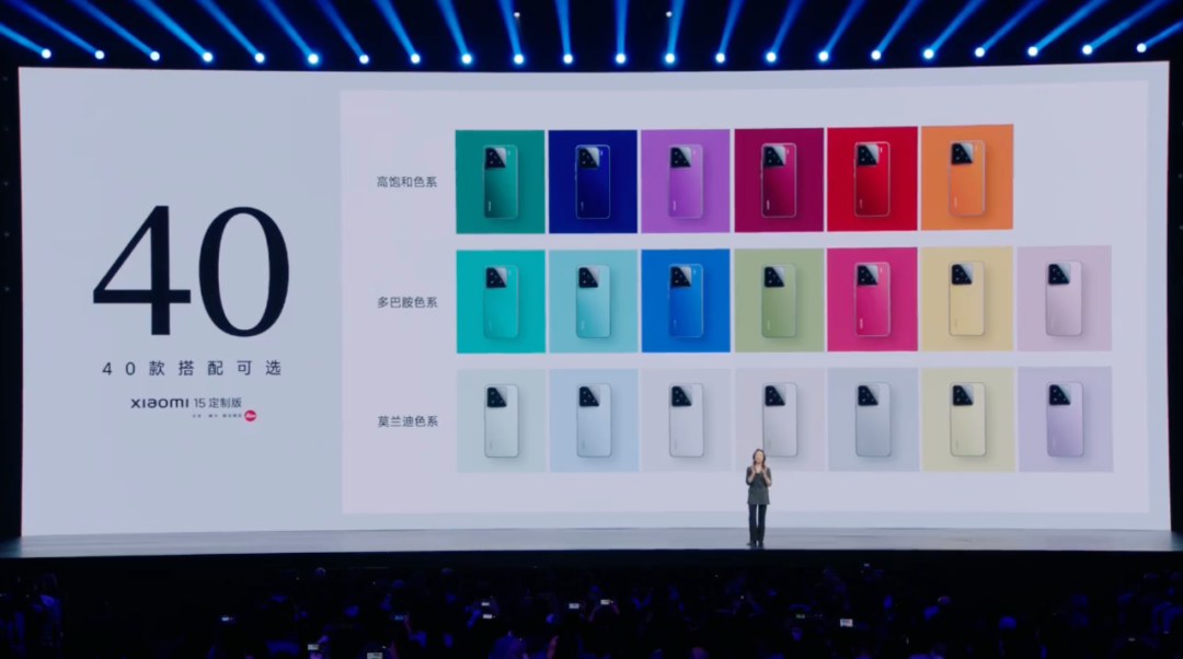 外观配色这次是重点,除了丁香紫、浅草绿、白色、黑色4个常规配色外,小米15还带来了「小米15亮银版」、「小米15钻石限定版」、「小米15定制版」,组合下来一共高达48个颜色版本。