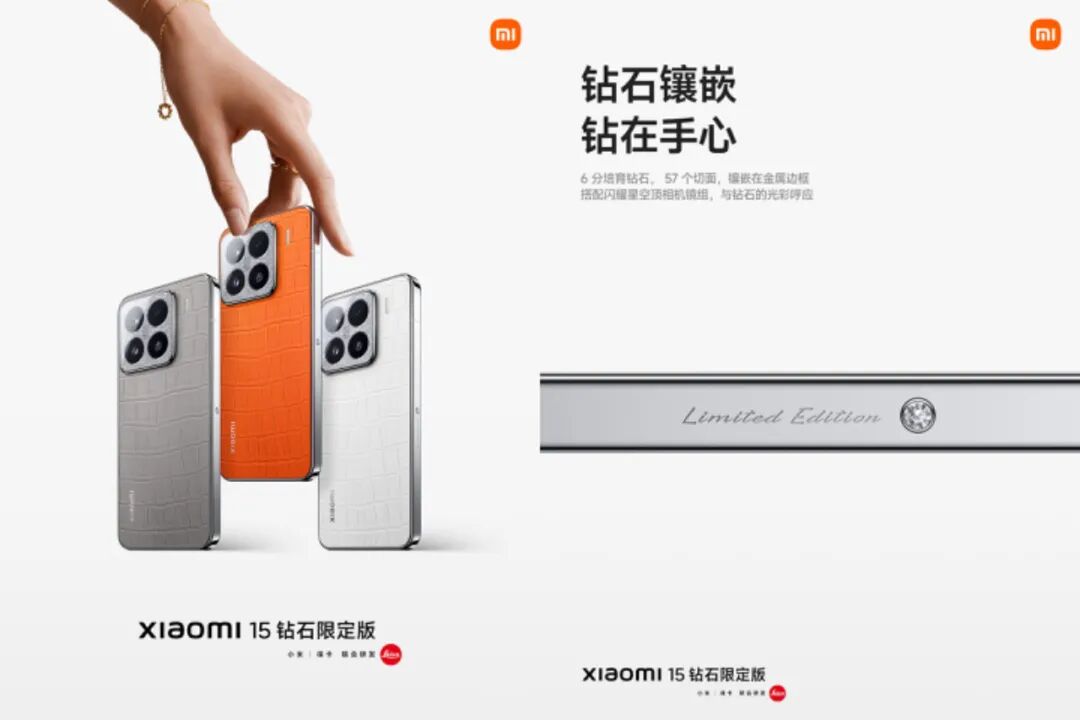 「小米15钻石限定版」采用星光顶相机模组、鳄鱼皮纹理(环保科纳皮)、中框镶嵌钻石(培育钻石),提供冰川白、大象灰、橙色3个配色, 16GB+1TB版售价5999元(比普通版贵500块),小米商城限定。