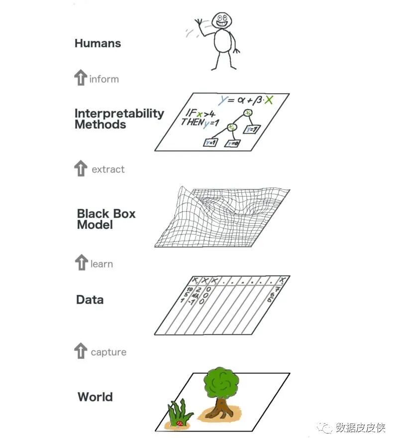 这里有一个可解释机器学习的大框架。在某种程度上,我们通过从真实世界(World)中获取一些原始数据(Data),并用这这些数据进行更深入的预测分析(Black Box Model)。而模型的解释性方法(Interpretability)只是在模型之上增加了一层,以便于人们(Humans)更好地理解预测过程。
