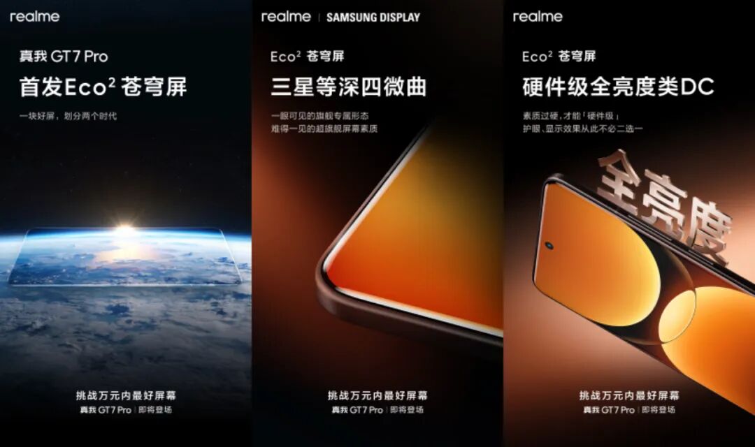 如上图所见,真我GT7 Pro预热将全球首发Eco²苍穹屏,采用一块居中单挖孔的三星等深四微曲显示屏,带来硬件级全亮度类DC调光方案、默认开启护眼拉满,并称要“挑战万元内最好屏幕”。