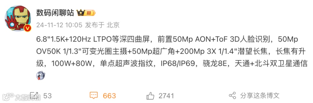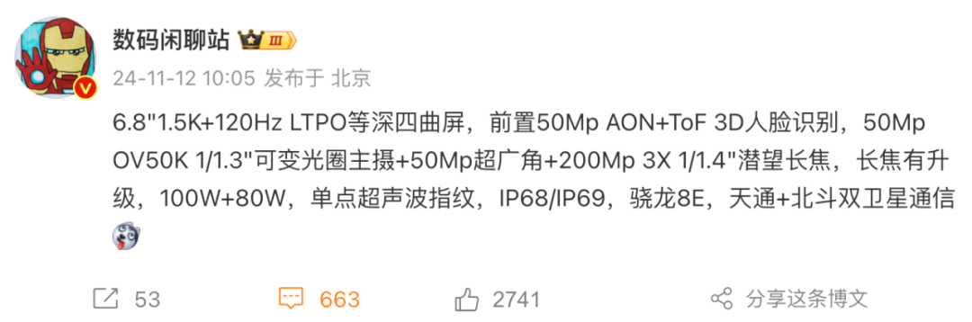 核心配置上,据数码闲聊站暗示,荣耀Magic7 RSR将采用6.8英寸1.5K 120Hz LTPO等深四曲屏,单点超声波指纹,前置50MP AON+ToF 3D人脸识别,后置三摄①50MP OV50K 1/1.3"可变光圈主摄 ②50MP超广角 ③200MP 3X 1/1.4"潜望长焦,长焦有升级,电池容量不到6K毫安时,配备100W有线充和80W无线充,支持IP68/IP69,搭载骁龙8至尊版,支持天通+北斗双卫星通信,将于12月发布,大家可以猜波价格了~