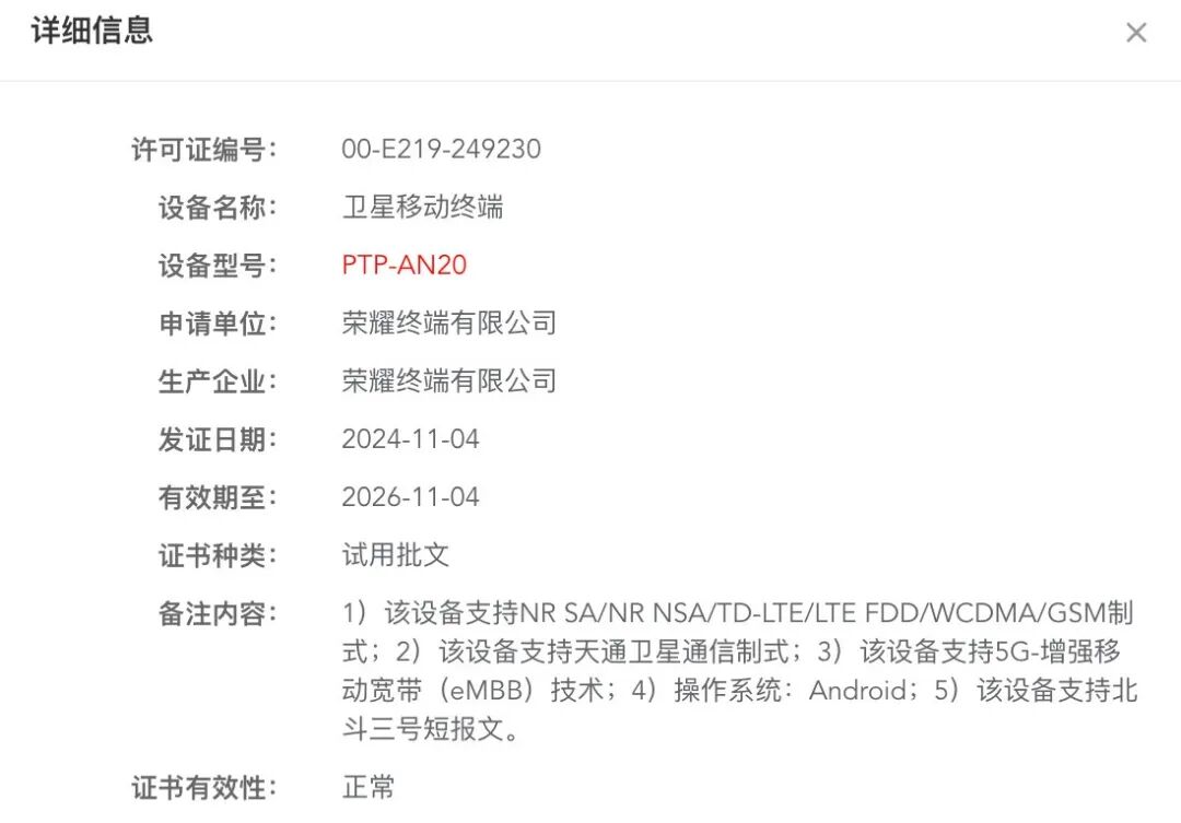 据相关报道,荣耀Magic7 RSR保时捷设计版本型号为PTP-AN20,已于11月4日拿到入网许可证,支持天通卫星通信。