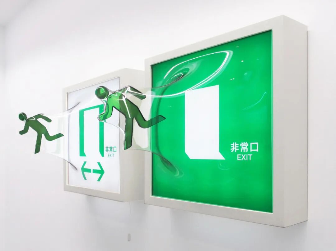 出口标志是人们在紧急状态下安全方向的指引,但紧急对于出口标志中的霓虹灯人来说,则似乎是想要逃离二维的禁锢。