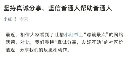 针对网友吐槽小红书上“滤镜景点”问题,小红书在昨天也正式道歉,承认部分用户存在过度美化笔记的情况。