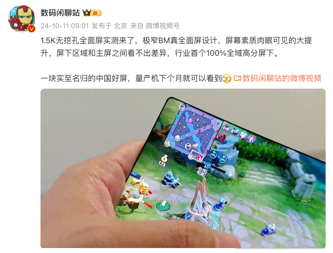 值得一提的是,此前该博主还曾分享过1.5K无挖孔全面屏实测的小视频,称这块极窄BM真全面屏设计的屏幕素质肉眼可见的大提升,屏下区域和主屏之间看不出差异,行业首个100%全域高分屏下。一块实至名归的中国好屏,量产机下个月就可以看到,大家可以期待下~
