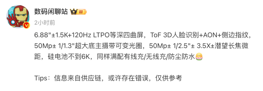 如上图所见,据数码闲聊站暗示,供应链透露的Mate 70标准版主要配置预计为:6.69英寸左右的1.5K直屏、侧边指纹,背部居中大圆三摄镜头,后置主摄为50MP 1/1.5英寸大底可变光圈,潜望长焦则为12MP 5X方案,支持无线充电和高规格防尘防水, 人脸解锁方案目前有待确认。(前期爆料仅供参考、最终以官方为准)