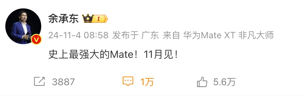 11月4日华为常务董事、终端BG董事长、智能汽车解决方案BU董事长余承东在微博预热称「史上最强大的Mate!11月见!」 官宣Mate 70系列将于本月发布,随后有爆料称华为Mate 70系列发布会或于11月26日举行,现在配置也有进一步爆料。