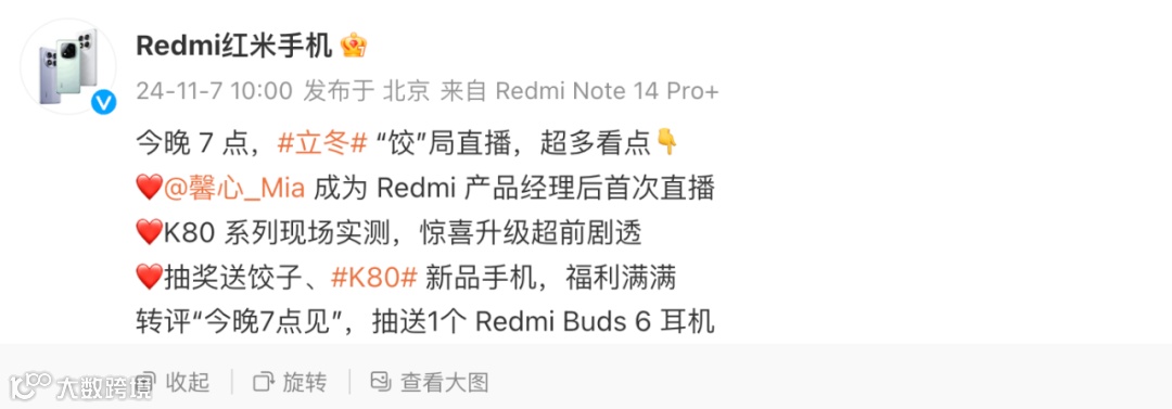 如上图所见,除了大家熟悉的Redmi品牌总经理王腾外,馨心也在,这也是馨心成为Redmi产品经理后首次直播,除了现场进行性能实测外,还会有“剧透”以及直播回答网友提问。猜测距离K80系列官宣发布日期应该快了,感兴趣的可以蹲蹲看~