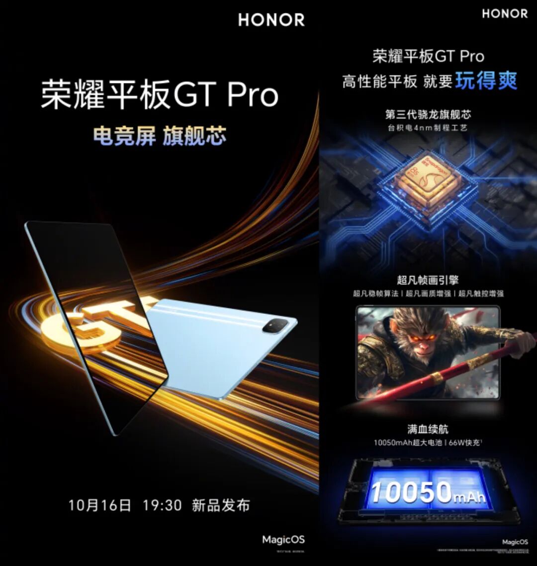 据官方预热,荣耀平板GT Pro主要配置有:12.3英寸3000*1920分辨率的3K OLED电竞屏,144Hz自适应刷新率,180Hz触控采样率,峰值亮度1600nits,最高4320Hz超高频PWM调光, 配备八扬声器,搭载骁龙8s Gen3处理器,10050mAh电池、66W充电。
