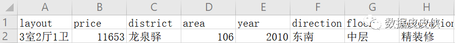利用后羿采集器在安居客官方网站爬取二手房的房屋信息,共有3727条数据。经过筛选,删去25条个别字段空白缺失的数据后,保留3602条,由于前三个字段对后续分析的作用不是很大,所以仅保留后8个字段,数据结构特征分别为图1和图2.