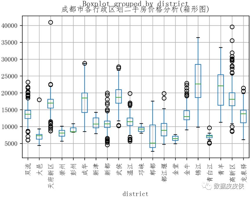 图6 成都市各行政区二手房平均价格分析(箱型图)