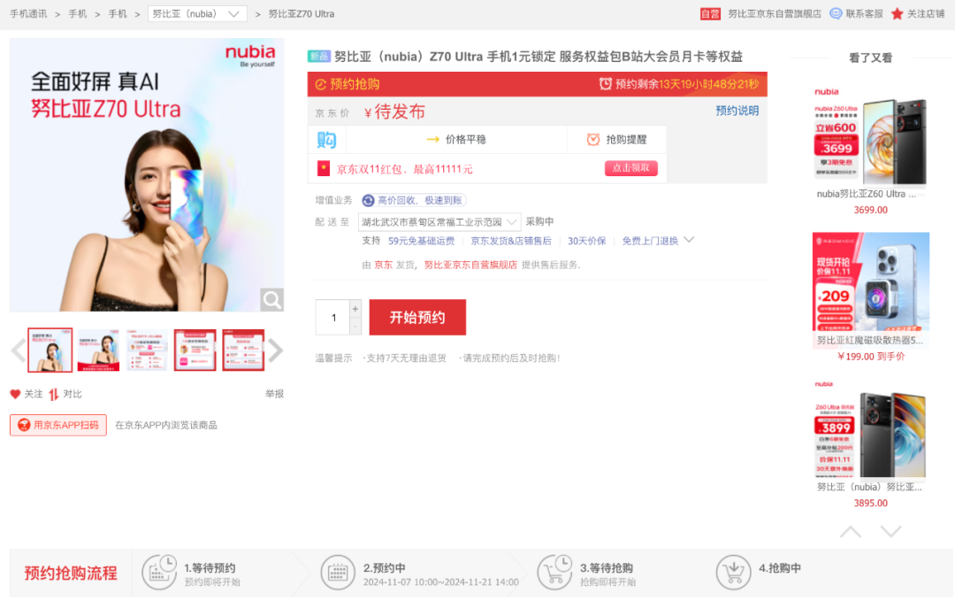 官方还宣布Z70 Ultra即日起开启1元预约活动。参考电商页面的11月21日截止预约,猜测努比亚Z70 Ultra或许会在本月下旬正式发布,喜欢真全面屏的小伙伴可以蹲蹲看~