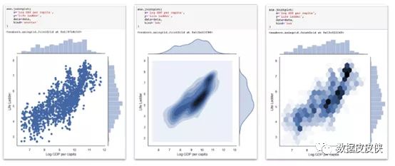 每当我想要直观地探索两个或多个变量之间的关系,总是用到某种形式的散点图和分布评估。在概念上相似的图表有三种变体。在每个图中,中心图(散点图,二元KDE,hexbin)有助于理解两个变量之间的联合频率分布。此外,在中心图的右边界和上边界,描述了各自变量的边际单变量分布(用KDE或直方图表示)。