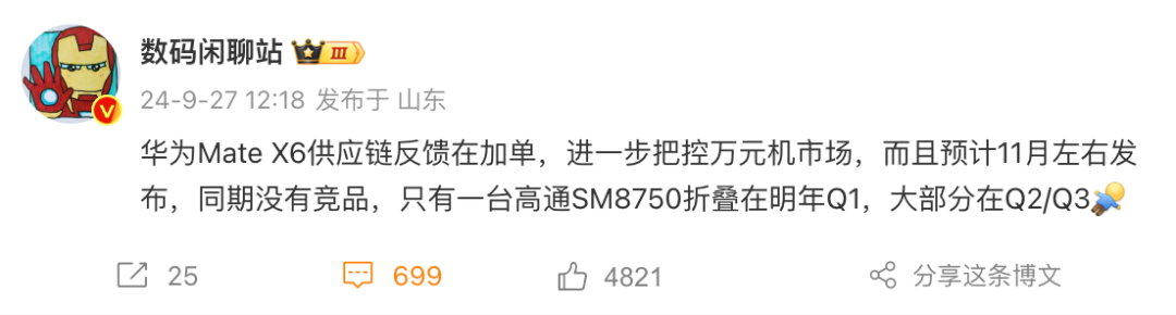 如上图所见,爆料达人数码闲聊站称:「华为Mate X6供应链反馈在加单,进一步把控万元机市场,而且预计11月左右发布,同期没有竞品,只有一台高通SM8750折叠在明年Q1,大部分在Q2/Q3」