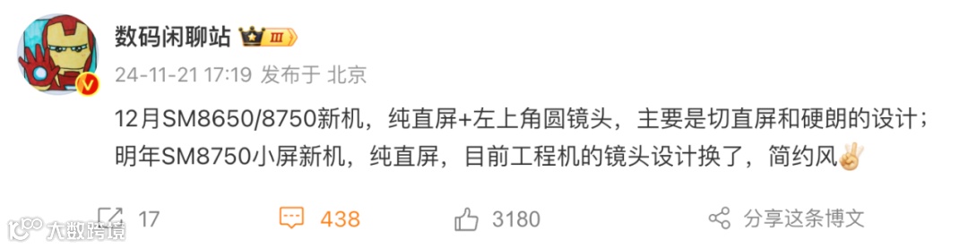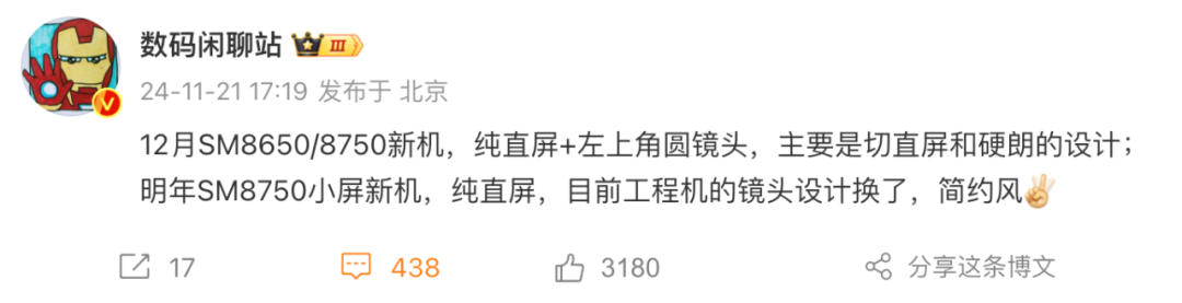 该博主还暗示明年一加Ace系列还会推出骁龙8至尊版小屏新机,纯直屏,工程机镜头设计也换成了简约风,结合此前爆料这台小屏开案时设定在6.1-6.3英寸左右,预计明年第二季度发布,大家觉得会命名为什么?
