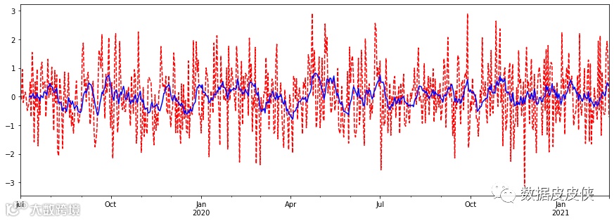 通过画图库来看原始序列与滑动窗口产生序列的关系图,原始数据用红色表示,移动平均后数据用蓝色点表示: