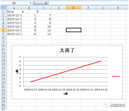 chart_lin = workbook.add_chart({'type':'line'})chart_lin.add_series({'name':'=sheet1!$B$1','categories':'=sheet1!$A$2:$A$7','values': '=sheet1!$B$2:$B$7','line': {'color': 'red'},})chart_lin.set_title({'name':'太南了'})chart_lin.set_x_axis({'name':"x轴"})chart_lin.set_y_axis({'name':'y轴'})chart_lin.set_style(1)worksheet.insert_chart('A10',chart_lin,{'x_offset':25,'y_offset':10})