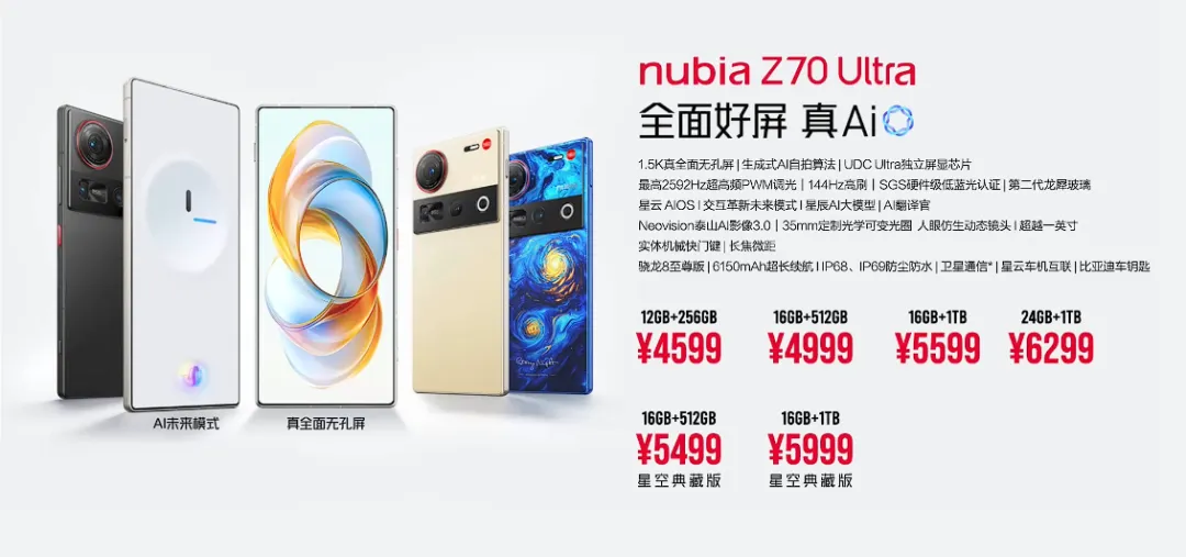 作为参考,【努比亚Z70 Ultra】12+256GB版本售价4599元,16+512GB版4999元、16GB+1TB版5599元,24GB+1TB版6299元;星空典藏版额外支持卫星通信,16+512GB版售价5499元,16GB+1TB版5999元,假设以1亿元销售额去估算,除以6个版本的均价5499元,也就是首销销量预估至少1.81万台,大家觉得这个表现怎么样?