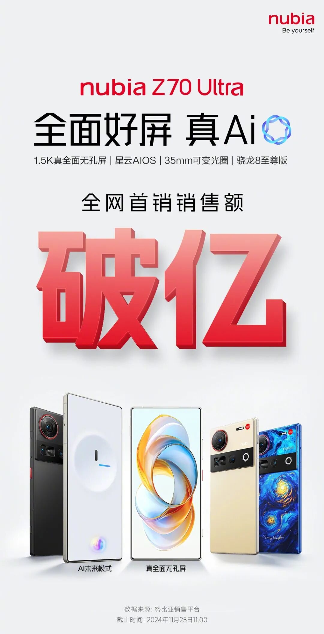 如上图所见,努比亚表示:截止11月25日11点,Z70 Ultra全网首销销售额破亿元。