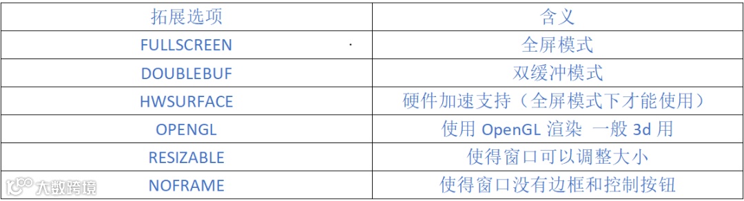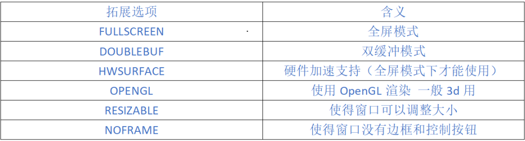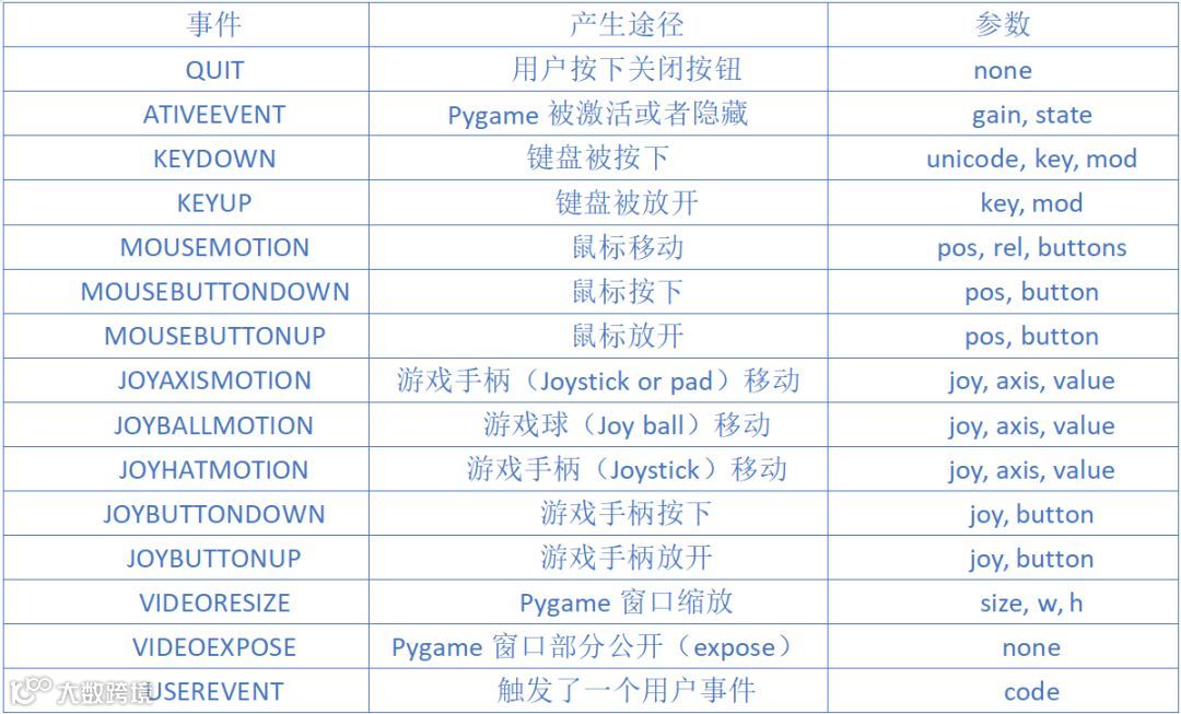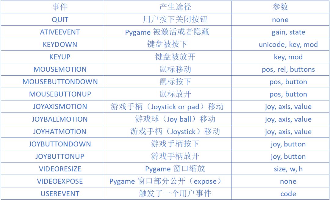 pygame.event.wait()使得Pygame等到发生一个事件才继续下去;而pygame.event.poll()一旦调用,会根据现在的情形返回一个真实的事件,或者一个“什么都没有”。下表是一个常用事件集: