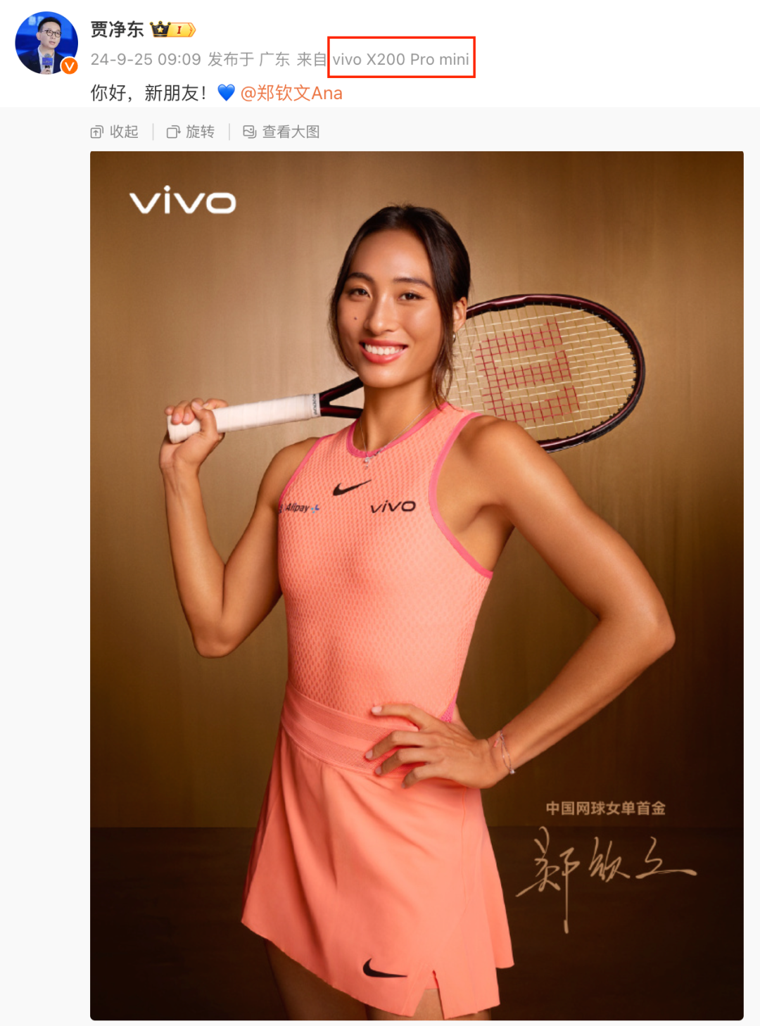 如上图所见,vivo品牌副总裁、兼品牌与产品战略总经理贾净东在微博提前露出了小尾巴,机型名正是vivo X200 Pro mini,此外这条微博还公布了vivo最新合作的代言人:郑钦文。(中国网球运动员,2024巴黎奥运会网球女单冠军,也是中国首位奥运网球单打冠军)