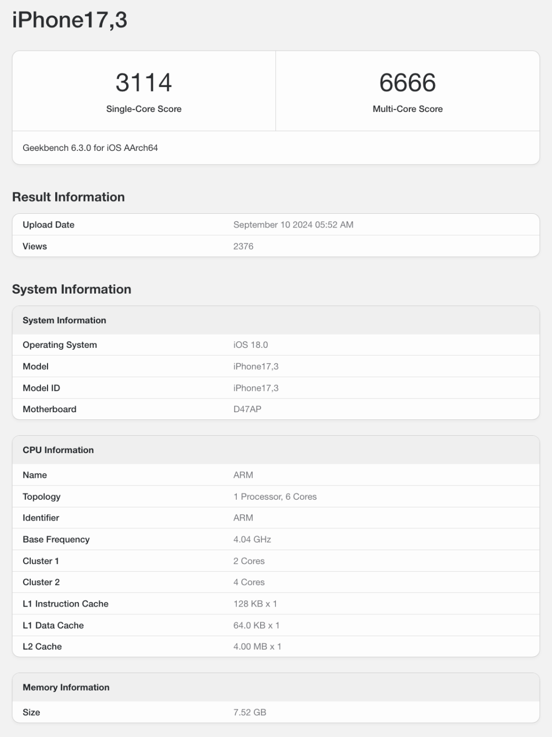 如上图所见,型号为iPhone17,3的新机对应iPhone 16,内存8GB,Geekbench 6单核跑分3114,多核跑分6666。作为参考,上代6GB运存、搭载A16的iPhone 15单多核成绩2600±/6700±。